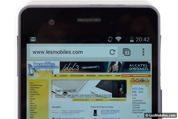Les choses prennent une autre tournure à l'allumage puisque nous découvrons un écran d'assez bonne qualité. Ce n'est certainement pas le plus fin que nous ayons vu puisque, avec une diagonale de 5,5 pouces et une définition HD, sa résolution n'atteint même pas les 300 pixels par pouce mais il se rattrappe dans d'autres domaines. Les couleurs sont vives mais pas trop, les angles de visions sont plutôt ouverts et la luminosité est suffisamment bonne pour maintenir un bon niveau de lisibilité en plein soleil, à condition que la dalle soit propre...