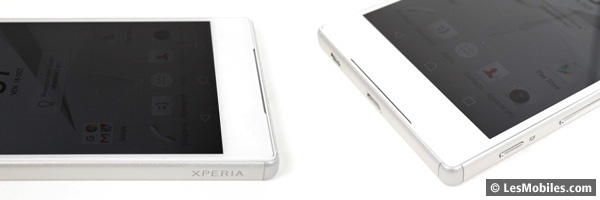 À l'avant, nous retrouvons toujours cette grande dalle tactile entourée de bordures encore épaisses. L?écran ne monopolise pas encore 70 % de la surface, alors que certains concurrents dépassent les 75 %. De face, le Z5 ressemble beaucoup au Z3+ : webcam proche du logo Sony, haut-parleurs stéréo cachés dans les épaisseurs des tranches. De dos également, la ressemblance est frappante, puisque les éléments distinctifs (marquage, objectif photo, flash) sont placés aux mêmes endroits. Sur les tranches, nous retrouvons, comme annoncés précédemment, la configuration du Z5 Compact, notamment les touches de volume déplacées vers le bas, entre le lecteur d'empreinte et le déclencheur photo. Ici aussi, le port propriétaire présent dans les Xperia Zx à leurs débuts a disparu.