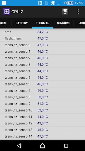 Nous avons réalisé des benchmarks et la coque était tiède, légèrement chaude (c?était d'ailleurs dans les phases de téléchargement que le smartphone chauffe le plus, ce qui nous fait douter de la source calorifique). Mais rien de désagréable, ni d'inquiétant. Pourtant, CPU-Z nous a indiqué que la température à certains endroits du smartphone monte jusqu? à 58°C pour redescendre aussi sec sous la barre des 50°C, puis 45°C. En clair : le système de dissipation de chaleur fonctionne à merveille. Et nous supposons que c'est l'une des raisons de l'embonpoint du téléphone vis-à-vis du Z3+.
