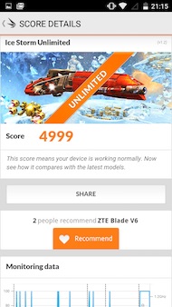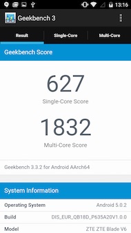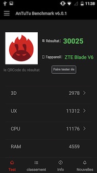 Pour le prouver, voici quelques scores obtenus avec le V6 : 30 025 points sur AnTuTu v6, 700 points sur Basemark OS II (une petite contre-performance due au chipset graphique), 627 points sur Geekbench single-core et 1832 points en multi-core, ou encore 4999 points sur 3DMark Ice Storm Unlimited. Faisons une petite comparaison avec le Blade S6 : 31 080 points sur AnTuTu, 689 points sur Basemark OS II et 7624 points sur 3DMark. À l?époque, nous étions déjà déçus par les performances du S6, notamment vis-à-vis d'autres plates-formes avec la même configuration. Nous verrons en conclusion de ce test que cette comparaison n'est pas fortuite.