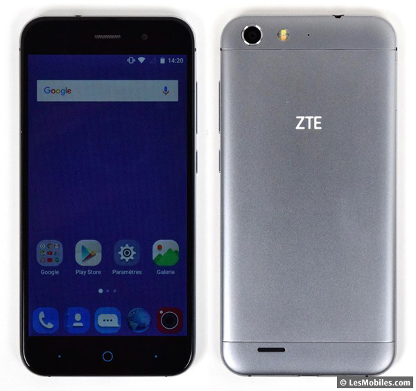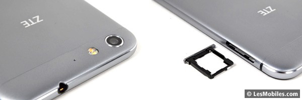 Autres modifications dans le châssis, ZTE a choisi de supprimer le second tiroir pour la carte microSD et de rendre son deuxième port SIM compatible avec les extensions de mémoire. Si pour la majorité des usagers (qui n'ont qu'une seule ligne) cela ne change rien, pour ceux qui ont deux lignes, il faudra choisir entre le dual SIM et la carte mémoire. Pour le reste, la configuration ergonomique du mobile est assez classique avec les boutons rassemblés à droite, le port microUSB en bas, le port jack 3,5 mm en haut et le capteur photo coincé en haut à gauche, face au haut-parleur.