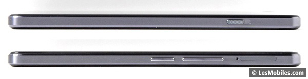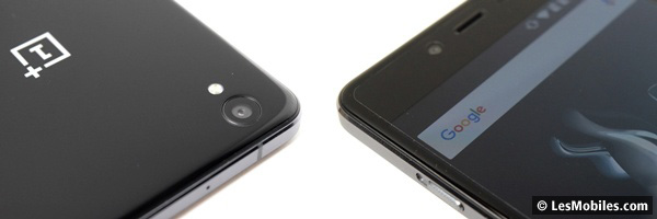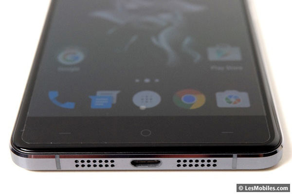 Les tranches sont habillées du contour en aluminium ciselé très agréable et finement travaillé. Les séparations pour les antennes sont placées sur les tranches inférieure et supérieure. L'une d'entre elles est cachée avec le jack 3,5 mm, lequel se trouve en haut, avec le micro secondaire. À l'opposé, un port microUSB (un retour en arrière vis-à-vis du OnePlus One) et deux grilles de haut-parleurs comme sur le OnePlus 2.