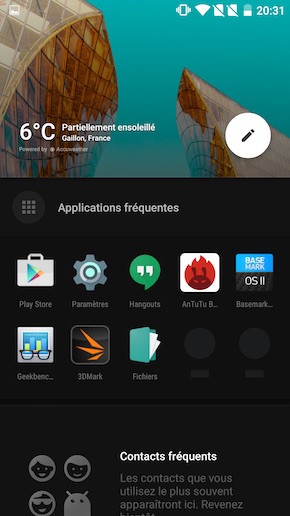 Deux remarques ergonomiques. D'abord, vous remarquerez sur les captures d?écran que l'interface est majoritairement noire. Puisque l?écran est Amoled, le « mode sombre » est automatiquement activé. Il est possible de changer cela pour passer en mode normal. Ensuite, vous remarquerez qu'un panneau se situe à gauche de l?écran d'accueil. Il s'agit de Shelf, la réponse de OnePlus à HTC Blinkfeed, Google Now Launcher ou encore au nouvel écran de Siri dans iOS 9. Cet écran propose un accès rapide à la météo, aux applications fréquentes et aux contacts préférés.