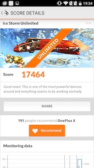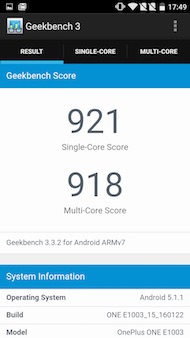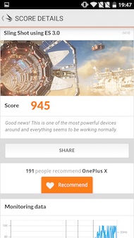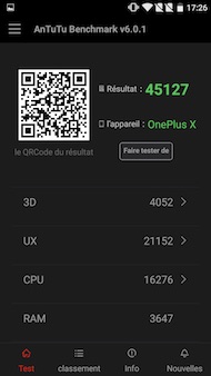 Malgré tout, le OnePlus X est un mobile fluide qui répond efficacement aux sollicitations. Les scores sur les benchmarks montrent d'ailleurs que le Snapdragon 801 ne résiste pas trop mal aux assauts du temps et de l?évolution des OS. Sur AnTuTu, il parvient au score de 45127 points. Sur Basemark OS II, il obtient 1207 points. Sur Geekbench, ses scores sont très étonnants : 921 points en mono-core et 918 points en multi-core. C'est la première fois que nous voyons un score multi-core plus faible qu'en mono-core. Nous attribuons cela à la plate-forme 32-bit. Sur 3DMark, le mobile atteint 17464 points, un excellent score pour du milieu de gamme. Sans surprise, l?Adreno 330 est largement meilleur face aux ARM Mali-T7xx, et même face à l?Adreno 405. Il irait presque tenir tête à l?Adreno 418 du Snapdragon 808...