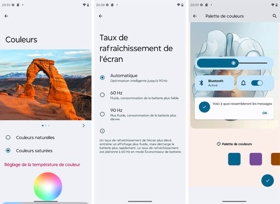 Dans les paramètres, il est possible de choisir entre l’affichage de couleurs saturées ou naturelles. Il est aussi possible de jouer sur la température des couleurs pour obtenir une teinte plus froide ou plus chaude. Concernant la fréquence de rafraîchissement, il est possible de sélectionner le mode le plus adapté à votre utilisation entre Auto (maximum 90 Hz), 60 ou 90 Hz. Rappelons qu’une fréquence élevée consomme plus d’énergie et donc réduit l’autonomie de l’appareil. À contrario, si la fréquence est faible, l’autonomie est plus importante. Sauf pour des usages spécifiques, il est donc conseillé de sélectionner le mode automatique qui va gérer les besoins en fonction des applications en cours d’utilisation et de la consommation d’énergie afin de trouver le meilleur compromis.