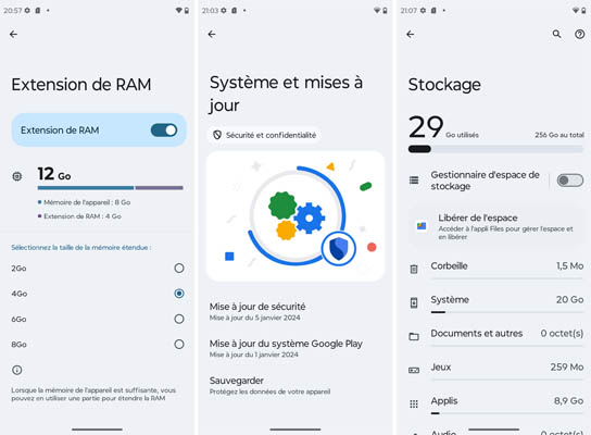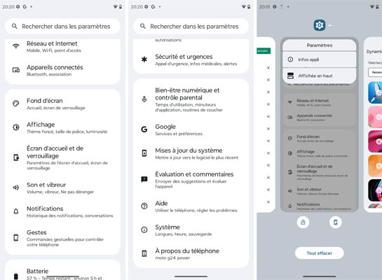 Comme les autres mobiles sous Android, l’interface est manipulable avec les gestes ou en utilisant les trois touches virtuelles en bas de l’écran. Les options sont nombreuses et pertinentes. On apprécie également les possibilités de sécurité et de confidentialité, mais aussi ceux relatifs aux cas d’urgence, de bien-être numérique et de contrôle parental. Le gestionnaire d’applications permet de faire une capture d’écran ou de fermer toutes les applications en cours d’exécution. Notez qu’il est également possible de verrouiller une application pour qu’elle ne se ferme pas. On peut aussi l’afficher dans la partie haute de l’écran pour en ouvrir d’autres. Attention, ce n’est toutefois pas aussi pratique que le mode multifenêtres proposé sur certains modèles, plus haut de gamme.