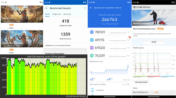 Comme pour les autres mobiles, nous l’avons soumis à plusieurs outils de mesure de performances dont voici les principaux résultats. Notez que le processeur accuse quelques baisses de régime tout au long du test, ce qui n’est jamais une très bonne chose. Heureusement, il ne chauffe pas beaucoup.