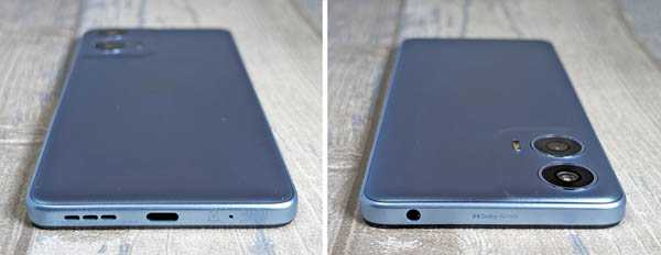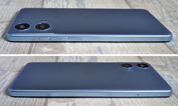 Les profils du Motorola g24 Power sont relativement plats, sauf sur les bords au niveau où l’écran et la coque arrière les rejoignent. Sur le profil droit, il y a le bouton de mise en veille ainsi qu’un double bouton pour gérer le volume. Leur taille est suffisante pour être facilement « accrochés ». Sur le profil supérieur, il y a la prise audio jack pour brancher un casque, comme sur le Redmi 13C et le Galaxy A15. Sur le profil gauche, il y a le tiroir à cartes SIM et mémoire. Il est protégé contre les infiltrations d’eau. Il peut supporter deux cartes SIM simultanément ou une seule carte SIM et une carte mémoire, le cas échéant. Enfin, sur le profil inférieur, il y a un haut-parleur, le connecteur USB-C et un microphone.