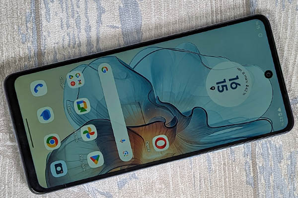 Le Moto g24 Power est équipé d’un écran avec une dalle LCD de 6,56 pouces en diagonale. Par rapport à la concurrence, seuls le Xiaomi Redmi 13C et le realme C67 proposent des surfaces plus grandes avec, respectivement 6,74 et 6,72 pouces. Le Samsung Galaxy A15 se distingue avec une dalle AMOLED bien plus qualitative notamment pour la profondeur de noirs et les couleurs qui apparaissent plus vives. L’écran est totalement plat avec des bords qui ne sont pas exceptionnellement fins. Sa définition est de seulement 720x1612 pixels, comme le Redmi 13C alors que les autres profitent d’une plus grande définition permettant une meilleure lisibilité. Comme la concurrence, il propose une fréquence de rafraîchissement maximale de 90 Hz, ce qui est aujourd’hui de mise sur tous les modèles, à minima, mais sa luminosité est particulièrement limitée. Si cela ne pose pas de problème en intérieur, en cas de fort soleil, il a du mal et il faut créer les conditions les plus ombragées pour y voir quelque chose.