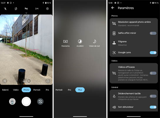 La fonction Google Lens est immédiatement disponible, à gauche, ainsi que les filtres, à droite. Dessous, il y a les modes Ralenti, Vidéo, Photo, Portrait, Pro et Plus. Dans ce dernier menu, on trouve d’autres modes : Filtre couleur, Vision de nuit, Panorama, Double capture, Série de photos, Accéléré, Filtre couleur (pour les vidéos) et double capture (pour les vidéos).
