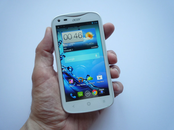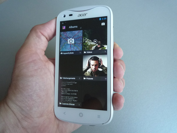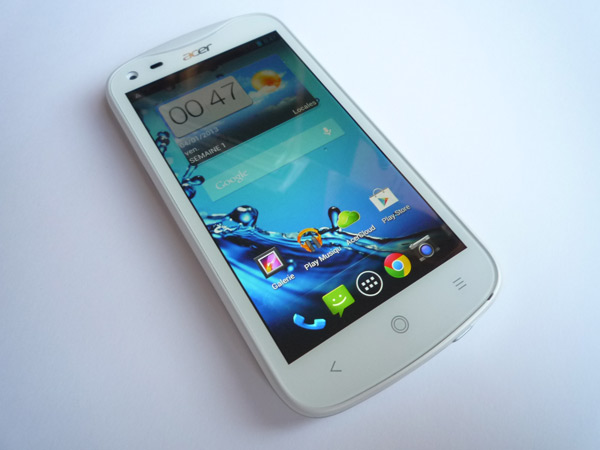 Sur la face avant, on retrouve l'incontournable écran 4,5 pouces où se trouve le capteur frontal, le logo Acer, un écouteur un capteur de luminosité, une LED de notification, mais aussi 3 touches sensitives et une entrée micro.