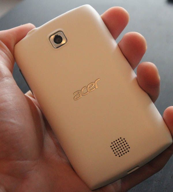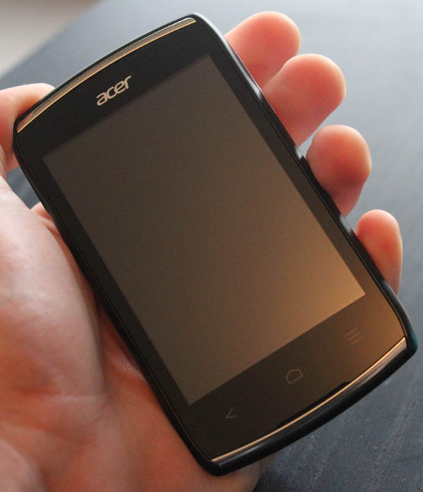 Cela faisait clairement longtemps que nous n'avions pas eu de smartphone à l?écran de 3,5 pouces sur Android. Même dans l'entrée ou le milieu de gamme, les constructeurs sont passés très largement à des modèles entre 3,7 et 4 pouces. Du coup, les mensurations de cet engin ne sont pas déroutantes et vous comprendrez donc qu'il tient très bien en main. Jolie prouesse d'ailleurs : Acer a fait un smartphone petit, mais pas trop petit. Les touches de fonctions ne sont pas difficiles à atteindre, même pour des mains assez grosses, habituées aux colosses de 4,5 pouces et plus.