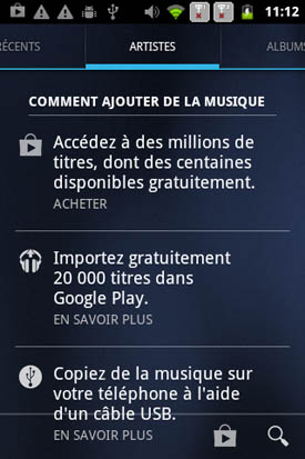 Bonne idée : il n'y a pas de lecteur MP3. Pourquoi bonne idée ? Eh bien parce que Acer a préféré installer par défaut Google Music, bien plus performant que les lecteurs MP3 par défaut. Le logiciel de Google vous permettra de lire la musique stockée sur votre appareil, cela va de soi, mais aussi de diffuser la musique que vous aurez téléchargée au préalable sur le service en ligne depuis votre ordinateur. En d'autres termes, pour peu que vous ayez une connexion 3G, vous aurez accès à toute votre bibliothèque audio personnelle n'importe où ? avec bien entendu la possibilité de l'enrichir grâce au magasin intégré.