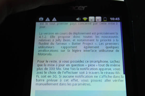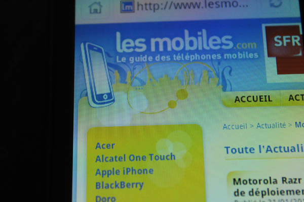 On ne va pas se mentir : sur un smartphone à 99 ?, on ne peut décemment pas trouver un écran révolutionnaire. 480x320 pixels, c'est une définition très faible. 3,5 pouces, c'est petit. La dalle en elle-même n'est pas géniale non plus : les angles de vision sont limités et les couleurs saturent très vite si vous ne regardez pas le smartphone pile en face. De manière générale, à l?écran, les couleurs ne sont de toute façon pas très fidèles non plus (vous comprenez pourquoi Acer a choisi une vague d'un bleu pétant pour son fond d?écran par défaut?).