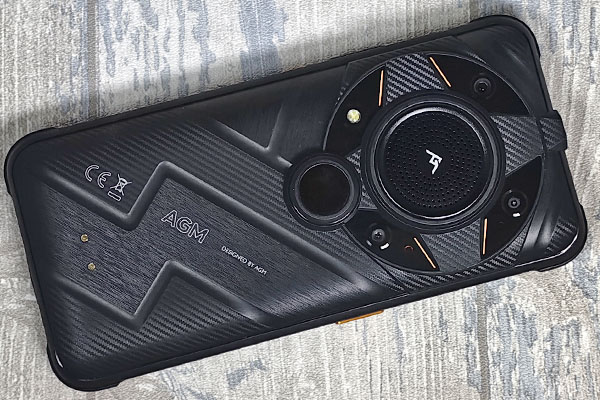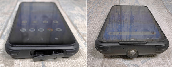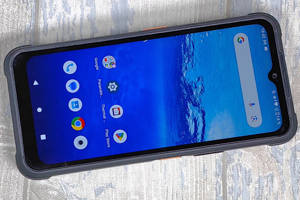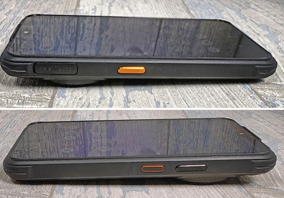 Si on fait le tour de l’appareil, on remarque la présence du bouton de mise en veille sur le profil droit ainsi que celui qui permet de gérer le volume. Ce dernier profite d’une légère texture pour le repérer plus facilement. Le bouton de mise en veille intègre le lecteur d’empreinte digitale qui permet de déverrouiller le mobile. Celui-ci nous a donné pleinement satisfaction réagissant plutôt promptement et barrant la route à tout autre doigt que celui de notre testeur. Sur le profil supérieur, il y a la lampe torche. Celle-ci est plus puissante qu’un flash de mobile classique permettant de voir assez loin. Il y a également un petit trou pour un microphone. Sur le profil gauche, en regardant l’appareil de face, il y a un emplacement pour les cartes SIM et la carte mémoire. Aucun outil n’est nécessaire pour extraire le tiroir qui peut supporter une carte SIM et une carte mémoire ou deux cartes SIM, le cas échéant. L’emplacement est protégé contre les infiltrations d’eau grâce à une petite patte souple en caoutchouc. Celle-ci est accrochée à la coque principale de l’appareil. En cas de perte, le fabricant a pensé à en fournir une supplémentaire dans la boîte. C’est pratique. Toujours sur le profil gauche, il y a un bouton personnalisable auquel on peut attribuer un raccourci vers une fonction spécifique du téléphone. La touche profite d’une texture pour l’identifier rapidement, au toucher, et il est d’une couleur orange, là aussi pour bien le distinguer. Enfin, sur le profil inférieur, protégé par une petite patte en caoutchouc, il y a le port USB-C et le port audio jack 3,5 mm pour brancher un casque. Là aussi, une patte de rechange est fournie, pour remplacer celle qui pourrait avoir été perdue. Notez la présence d’un deuxième microphone. Le mobile n’est pas compatible avec la technologie eSIM.