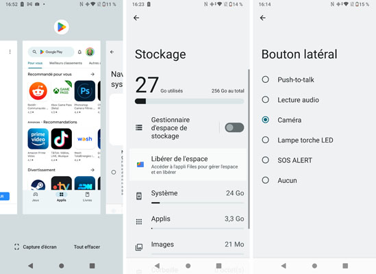 Concernant les applications préinstallées, toutes sont signées Google. Il y a cependant une application Boussole et celle qui est dédiée à la caméra thermique, Thermal AGM. Le système et les applications occupent 27 Go d’espace de stockage, une fois toutes les mises à jour réalisées. À ce titre, la mise à jour Google Play datait du 1er mars. On peut utiliser la navigation par gestes ou via les trois touches virtuelles en bas de l’écran.