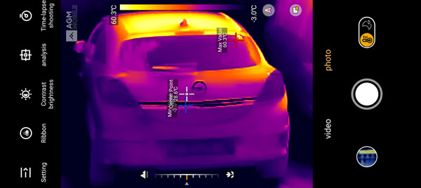 En plus des capteurs photo, il y a également le capteur thermique. Il faut passer par une application spécifique pour l’utiliser. Les photos prises avec l’application sont automatiquement enregistrées dans un album dédié dans l’application Photos et non pas avec toutes les autres. Si vous avez l’habitude de synchroniser les photos, il faut penser à ajouter le dossier en question. Au passage, notez que l’application n’est pas traduite (deux langues sont disponibles : anglais et chinois). Les paramètres ne sont pas compliqués à comprendre, mais ce n’est pas du meilleur effet. On peut prendre des photos, mais également filmer. Le module met 3 secondes pour être prêt. Il s’agit donc d’une caméra thermique longue portée. C’est très pratique pour un usage en extérieur mais on peut également s'en servir en intérieur.
