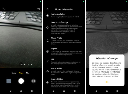 L’interface de l’application appareil photo est classique avec un menu Paramètres accessible dans le coin supérieur à droite de l’écran. Au centre, il y a la zone de cadrage et jusque au-dessus des modes d’images, il y a plusieurs niveaux de zoom : 1x, 2x, 3x et 5x. Il n’est pas question ici de zoom optique, mais numérique avec la dégradation qui va avec, mais qui peut parfois servir dans certaines circonstances. Les modes d’image disponibles sont Vidéo et Photo. Le menu Plus permet d’accéder à d’autres modes : Haute résolution, Détection infrarouge, macro photo, rapide, HFR, Vidéo infrarouge et vidéo Macro. Pour chacun de ces modes, une petite explication est donnée lors de la première ouverture. Certaines sont bien en français, mais d’autres ont été oubliés lors de la traduction des menus.