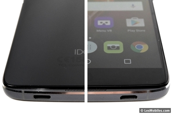 Avant d'aborder la fluidité du système et les performances de la plate-forme, faisons un premier tour du propriétaire. Nous remarquons rapidement qu?Alcatel a délaissé ici le plastique pour des matériaux beaucoup plus premium : le châssis en aluminium est pris en sandwich par deux plaques de verre minéral. À l'avant, les lignes sont globalement identiques à celle de l'Idol 3, où le contour métallique dépasse en haut et en bas de l?écran afin d'y insérer judicieusement les deux haut-parleurs / écouteurs téléphoniques.