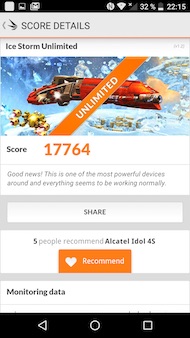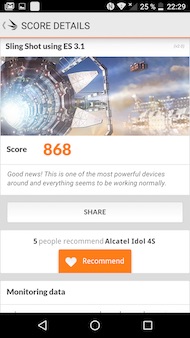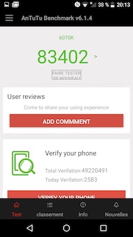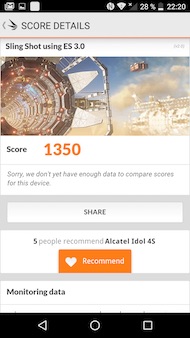 Côté performance, maintenant, la multiplication des applications ne semble pas affecter outre mesure le Snapdragon 652 qui équipe l'Idol 4S. Couplé à 3 Go de RAM et chargé d'animer un écran Quad HD, l'octo-core de Qualcomm se comporte relativement bien, même s'il chauffe un peu compte tenu du travail à effectuer. Sur les tests techniques, la plate-forme s'en sort globalement mieux qu'avec le Xperia X (alors que ce dernier est accompagné d'un écran Full HD seulement) et s'offre même parfois le luxe de flirter avec le Snapdragon 810 ou l?Exynos 7420 sur AnTuTu où il obtient 83402 points. Sur Basemark OS II, même constat : 1710 points sont un score comparable aux autres chipsets.