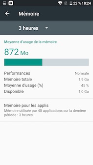 Environ 2,5 Go sont donc monopolisés par les applications préinstallées au lancement (l'ensemble de nos applications de test pèse 900 Mo environ), ce qui laisse environ 7 Go sur les 10 Go disponibles (car il faut compter aussi Android). Ce qui est évidemment peu. Sur l'Idol 4S, il en restait une vingtaine. De même, chaque application peut peser sur la RAM, et celle-ci est tout aussi ténue : 2 Go seulement. En moyenne, près de la moitié de la RAM est monopolisée par le système, ne laissant qu'un petit Go pour les applications (et les jeux...).