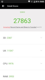 Ajoutez à cela un MT6737 de MediaTek et vous arrivez rapidement à une conclusion : le Shine Lite, sous ses beaux atours, ne peut rivaliser avec un Galaxy A3 (2016) et encore moins un Galaxy A5 (2016). Les chiffres obtenus sur les benchmarks le montrent : un peu moins de 28 000 points sur AnTuTu, 3571 points sur 3D Mark (Ice Storm Unlimited), 522 points sur Geekbench en single core et 1487 points en multi core. Les capacités du smartphone sont donc réduites. Nous passons sur le score de Basemark OS II, lequel est exagérément bas. L'outil de test pénalise le téléphone sur le rendu des pages web, lequel est anormalement bas, même pour le MT6737. Il devrait logiquement être au-dessus des 400 points, comme le MT6735.
