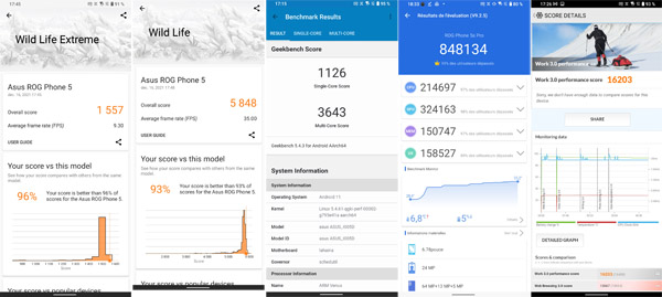 Par rapport au ROG Phone 5, la version 5s Pro profite d'une montée en gamme. En effet, le premier dispose d'une puce Qualcomm Snapdragon 888 tandis que le deuxième s'appuie sur le Snapdragon 888+, une version boostée du chipset de base. Sa fréquence d?horloge s'est vue augmentée afin de proposer une plus grande puissance de calcul et offrir ainsi de meilleures performances. En outre, le ROG Phone 5s Pro est équipé de 18 Go de mémoire vive ce qui en fait le smartphone ayant la plus grande capacité dans ce domaine. Autant dire que l'exécution des applications et des jeux les plus gourmands en ressources ne lui pose aucun problème. On passe d'une application à une autre avec une vélocité déconcertante tant le mobile est rapide. L'appareil, comme ses prédécesseurs, met à disposition un mode X qui optimiser les performances et se déclenche automatiquement dès qu'il détecte un jeu ou un outil de mesure. Comme sur le ROG Phone 5, nous avons trouvé que le mobile chauffe lorsqu'il est soumis à rude épreuve. Il peut être refroidi très efficacement par l'accessoire Aeroactive Cooler, évoqué plus haut. Comme les autres, nous avons utilisé plusieurs outils de mesure de performances bruts afin de pouvoir comparer les résultats.