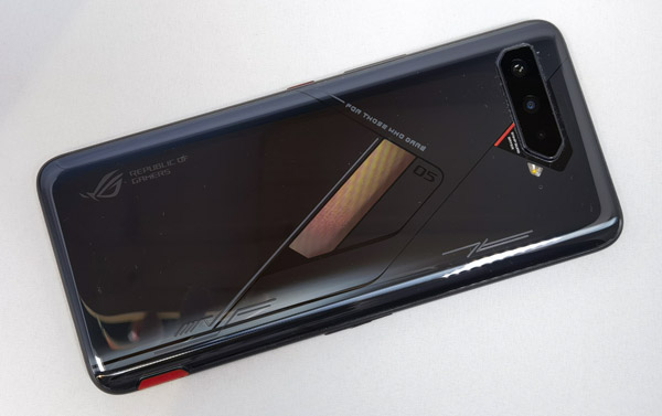 Son dos est aussi texturé que les précédents ROG Phone avec un bloc optique installé dans le coin supérieur gauche protégé par une forme biseautée dépassant légèrement du reste du dos de l'appareil. Le fabricant livre avec le mobile une coque de protection partielle qui ne recouvre pas entièrement le smartphone, mais seulement certaines zones laissant ainsi toutes les commandes parfaitement accessibles et faisant apparaitre une partie du dos du mobile. L'arrière du smartphone propose deux zones sensitives qui peuvent être activées dans les paramètres de l'application Jeu Genie, optimisant les moyens de contrôle, selon les jeux.