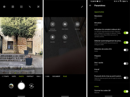 L'interface de l'application Caméra est très classique, personnalisable avec plusieurs modes immédiatement accessibles : ralenti, intervalle de temps, vidéo, photo, portrait, panorama, document et plus. Ce dernier donne accès aux modes : suivi de mouvement, pro vidéo, manuel, macro et nuit.
