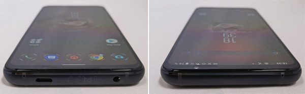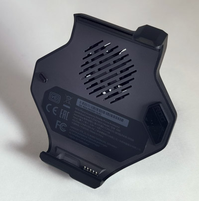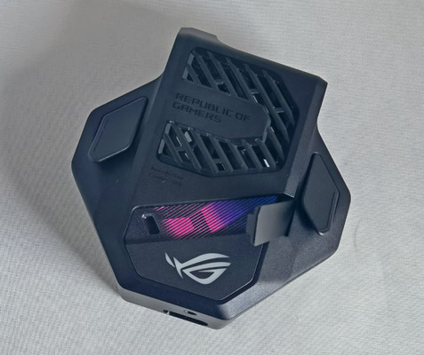 Sur le profil supérieur, il y a juste un microphone alors que sur le profil de gauche, il y a un connecteur USB-C pour recharger l'appareil pendant qu'on joue et un autre connecteur qui permet d'alimenter le dispositif de refroidissement prévu pour lui, l?Aeroactive Cooler. L'accessoire était livré avec le mobile, dans sa boîte. Les deux connectiques sont protégées par une petite partie en caoutchouc qui s'enlève très facilement. L?Aeroactive Cooler permet non seulement de refroidir l'appareil pendant qu'on joue, mais il propose également deux gâchettes physiques au dos et une béquille ce qui permet d'installer le mobile sur un bureau pour lire une vidéo, par exemple. Notez aussi la possibilité d'y brancher un casque plutôt que d'utiliser la prise du smartphone.