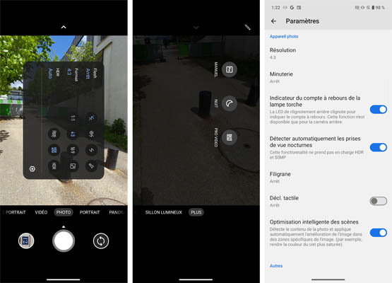 L'interface de l'application Appareil photo est relativement classique avec plusieurs options disponibles immédiatement en haut et d'autres auxquelles on peut accéder en appuyant sur la touche virtuelle ^ inversée. Dessous, il y a la zone de cadrage où on peut directement accéder à plusieurs niveaux de zoom : 0,7x, 1x, 2x et 3x. Plusieurs modes de prises de vue sont accessibles : Ralenti, Intervalle de temps, Vidéo, Photo, Portrait, Panorama, Sillon lumineux et Plus. Ce dernier menu permet d’accéder aux modes Manuel, Nuit et Pro Vidéo. Il est possible de les ajouter à ceux déjà présents au niveau de l’interface principale de l’application.