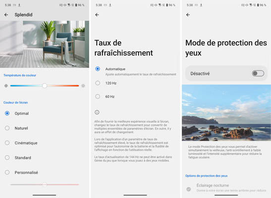 Dans les paramètres du téléphone, on peut choisir entre plusieurs couleurs de l'écran avec les modes Optimal, Naturel, Cinématique, Standard ou Personnalisé. Il est également possible de moduler la température de couleur. Activer l'anti-scintillement à faible luminosité est une option.