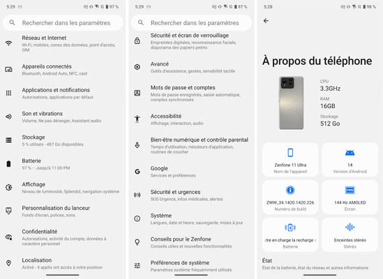 Le téléphone s'appuie sur la dernière version d'Android en l'occurrence Android 14 avec des mises à jour particulièrement récentes puisque celle de la sécurité datait du 1er décembre et celle du système Google Play du 1er mars 2024 pour des tests réalisés fin mars et début avril 2024. Asus propose des paramètres extrêmement complets permettant ainsi un très haut niveau de personnalisation. Dommage qu’Asus ne propose que 2 ans de suivi logiciel pour le système et 3 ans pour la sécurité.