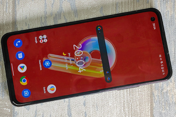 Pour le capteur photo frontal, il y a un poinçon qui est installé dans le coin supérieur à gauche. Il est assez petit et ne gêne pas trop l’affichage. On apprécie la taille de l’écran qui est facilement manipulable à une seule main. Les bords de l’écran ne sont pas les plus fins que nous ayons pu voir récemment. En effet, ils sont assez peu épais sur les profils, mais légèrement plus sur les parties hautes et basses, ce qui est toujours un peu dommage. Toutefois, cela reste tout à fait raisonnable et ne gêne pas vraiment.
