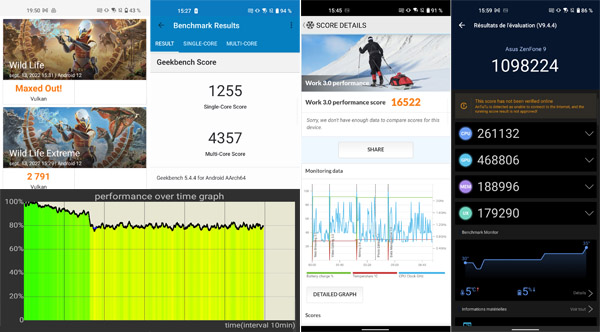 Pour son seul et unique modèle de smartphones classiques (hors les ROG Phone), Asus a choisi la puce la plus véloce du moment pour les mobiles sous Android, à savoir le chipset Qualcomm Snapdragon 8+ Gen 1. C’est la même puce que l’on trouve dans les ROG Phone 6, ROG Phone 6 Pro, Red Magic 7S Pro, OnePlus 10T, Samsung Galaxy Z Flip4, Samsung Galaxy Z Fold4, Motorola edge30 Ultra, par exemple. Elle est associée ici à 8 ou 16 Go de mémoire vive (notre modèle de test). Il n’y a pas de fonction d’extension de mémoire vive comme on peut maintenant en voir sur certains mobiles. Mais avec une telle quantité d’espace, cela ne pose aucun problème au mobile de lancer des applications avec une vélocité déconcertante et de permettre de jouer à des jeux parmi les plus exigeants avec un maximum de détails tout en assurant une très bonne jouabilité grâce à une excellente fluidité. Outre les éléments purement matériels, il faut également prendre en compte que le mobile exécute une version d’Android particulièrement épurée aidant aussi à obtenir de très bonnes performances. Après avoir installé de nombreuses applications, le smartphone reste parfaitement prompt et répond très rapidement à toutes les sollicitations auxquelles nous l’avons soumis.