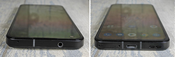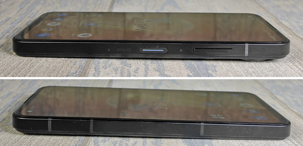 Un peu plus haut, il y a le double bouton pour gérer le volume. Le châssis est en métal. Les antennes installées tout autour de l’appareil sont très discrètes, en tout cas sur notre version noire. Sur le profil supérieur, il y a un port audio jack 3,5 mm pour brancher directement n’importe quel casque. Sur le profil inférieur, il y a le tiroir à cartes SIM. Celui-ci peut en supporter deux simultanément, mais pas de possibilité d’insérer une carte mémoire pour étendre la capacité de stockage. Il y a également un microphone, un haut-parleur et le connecteur USB-C.