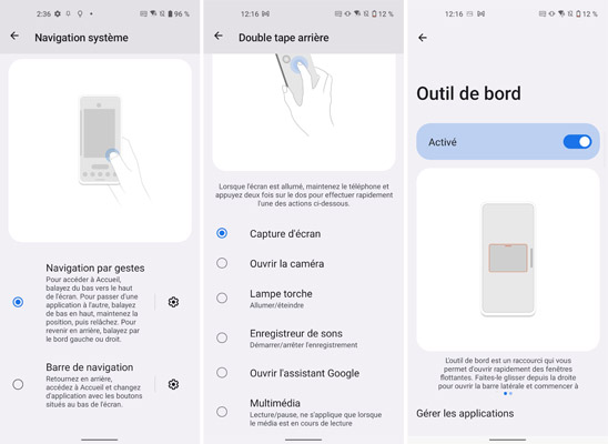 Concernant l’usage de la batterie, il y a un mode Haute performance, un autre Dynamique, un Durable et un Ultra durable qui économise, ou pas, de l’énergie tout en équilibrant la puissance délivrée. Notez la possibilité d’ouvrir des fenêtres flottantes pour y mettre certaines applications. Le dos peut accepter les doubles tapes pour faire une capture d’écran, ouvrir la caméra, allumer ou éteindre la lampe torche, ouvrir l’assistant Google, par exemple.