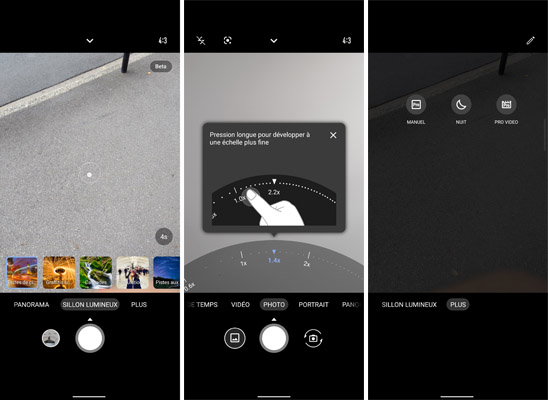 L’interface de l’application Appareil photo est classique dans le sens où quelques réglages sont disponibles en haut de l’écran, la fenêtre de cadrage affiche les modes de zoom 0,6x et 1x pour passer rapidement du capteur ultra grand-angle au principal. Excentré, le niveau de zoom (numérique) 2x est également disponible. En dessous, il y a les différents modes avec, de gauche à droite : Ralenti, Intervalle de temps (time-lapse), Vidéo, Photo, Portrait, Panorama, Sillon lumineux et Plus. Dans ce dernier menu, on trouve les modes Manuel, Nuit et Pro Vidéo. Il est possible de les intégrer avec les autres, si on est appelé à s’en servir souvent. Un guide de stabilisation peut s’afficher pour aider à garder le téléphone le plus immobile possible pendant une prise de vue.