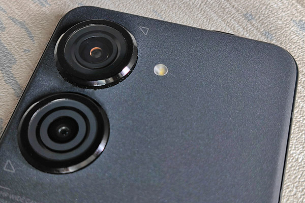 Les deux capteurs photo sont assez imposants, au dos, se présentant presque comme des hublots. Ils ressortent par rapport au reste de l’arrière du mobile et l’un est encore plus ressorti que l’autre. Il y a un flash LED, juste à côté. Le Zenfone 9 est décliné en bleu, en rouge ou en noir (notre modèle de test).