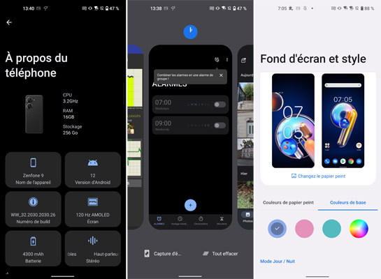 Dans les paramètres, on peut choisir plusieurs réglages, dont un affichage dynamique (option Automatique) ce qui signifie que c’est le mobile qui s’occupe d’optimiser la fréquence selon l’application en cours d’utilisation et de ses besoins. On peut aussi décider de bloquer la fréquence pour toujours avoir du 120 Hz, au risque d’obtenir une autonomie moindre avec une cadence moins élevée. On peut aussi choisir de rester en 60 ou 90 Hz. La dalle du Zenfone 9 est excellente. Elle propose une luminosité satisfaisante en toutes circonstances, aussi bien en plein soleil que dans la pénombre. Grâce à la technologie OLED, les noirs sont infinis et les couleurs sont ici plutôt bien calibrées même si on peut obtenir un peu mieux en passant par les paramètres du mobile. Plusieurs modes de couleurs sont disponibles : Optimal, Naturel, Cinématique, Standard ou Personnalisé avec la possibilité de jouer sur la température des couleurs.