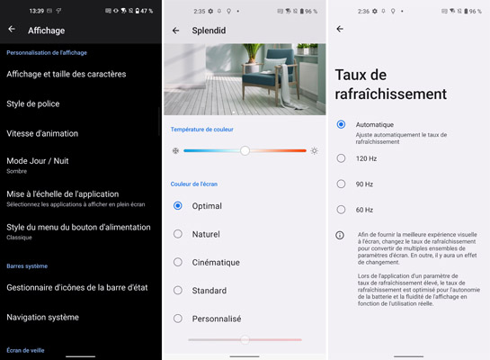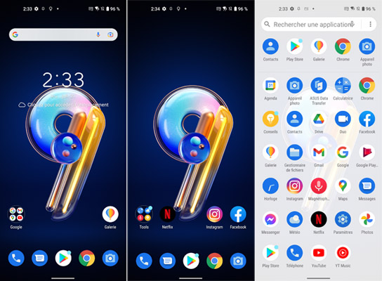 Le portail Google Discover est disponible sur le volet gauche des pages d’accueil. Les fonctions de raccourcis disponibles avec un balayage depuis le bord supérieur de l’écran sont nombreuses et il est possible depuis ce menu d’ouvrir les paramètres ou de redémarrer l’appareil, voire de l’éteindre. Les paramètres profitent d’une bonne hiérarchisation des différentes rubriques. Bien entendu, la navigation par geste est possible. Un module Génie du jeu est proposé pour rester concentré ainsi que la fonction Twin Apps pour avoir deux applications sur deux comptes distincts. Les mots de passe sont regroupés au sein d’un menu spécifique. On peut aussi compter sur les outils tels que le bien-être numérique, le contrôle parental et les services d’urgence proposés par Google pour transmettre automatiquement certaines informations dont la localisation à des personnes de confiance et potentiellement aider les secours en cas de problème.