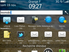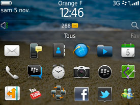 Une fois le smartphone allumé, la première nouveauté vient évidemment de la présence d'un écran tactile. Il offre une diagonale de 2,8 pouces, pour une résolution de 640 x 480 pixels, soit une densité de 287 pixels par pouce. Pour vous donner un ordre d'idée du bond qualitatif entre ce modèle et le précédent (Bold 9780), sachez que l'afficheur de ce dernier mesurait 2,4 pouces pour une résolution de 480 x 360 pixels. Le rendu est autrement plus flatteur sur le 9900. Et pour ne rien gâter, la luminosité est parfaite. Quant au rendu des couleurs et des contrastes, il est très soigné.
