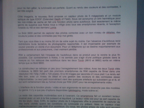 Côté imagerie, le nouveau Bold propose un capteur photo de 5 mégapixels et un module optique de type EDOF (Extended Depth of Field). Sous cet acronyme un brin hermétique pour les non-initiés se cache en fait une fonction photo sans autofocus. Soit exactement le même genre de supplice que Nokia nous a infligé avec tous ses smartphones récents, à l'exception notable du N8 et des derniers Lumia.
