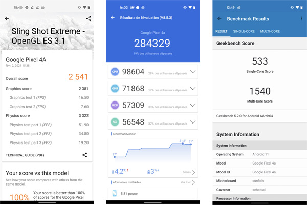 Techniquement, le smartphone Google Pixel 4a s'appuie sur une puce Qualcomm Snapdragon 730G. Elle est associée à 6 Go de mémoire vive, comme le Pixel 4a 5G. Le processeur est pensé pour le gaming ce qui lui permet d'offrir des performances tout à fait honorables pour la quasi-totalité des jeux, mais aussi, bien entendu des applications. Lors de notre phase de test, nous n'avons eu aucune saccade et le mobile s'est révélé véloce même avec de très nombreuses applications ouvertes simultanément.