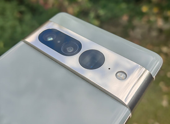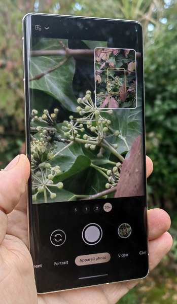 Pour la partie photo, le Pixel 7 Pro est équipé du même capteur de 50 mégapixels que le Pixel 6 Pro, l’ISOCELL GN1 développé par Samsung. Il est accompagné d’un capteur de 48 mégapixels stabilisé optiquement avec téléobjectif pour un zoom optique de 5x, un Sony IMX586 à la place du Samsung GM1 intégré sur le Pixel 6 Pro. Enfin, il y a également un capteur pour les photos ultra grand-angle, le même que sur le Pixel 6 Pro, soit un module Sony IMX381 de 12 mégapixels avec autofocus. Dans l’application Appareil photo ou plus exactement au sein de l’éditeur de photos, on retrouve la fonction Gomme magique qui permet d’effacer un élément indésirable, l’anti-flou qui rend les photos plus nettes (même si elles n'ont pas été prise avec l'appareil) et la fonction flou d’arrière-plan qui permet de moduler l’effet avec, justement, un arrière-plan plus ou moins flou, à posteriori. Sinon, l’interface de l’application pour prendre des photos est assez classique. Les niveaux de zoom 0,5x, 1x, 2x et 5x sont immédiatement disponibles. Notez la possibilité de filmer avec un effet cinématique.