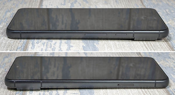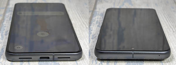 Sur le profil supérieur, il y a un microphone, alors que la tranche de gauche contient le tiroir pour les cartes SIM. On peut en utiliser deux simultanément, mais impossible d’insérer une carte mémoire pour augmenter la capacité de stockage du téléphone. Notez la compatibilité avec la technologie eSIM. Enfin, sur la tranche inférieure, il y a le port USB-C ainsi que deux haut-parleurs. Le châssis du mobile est en métal et on peut voir toutes les antennes installées sur le pourtour de l’appareil pour capter au mieux, quelle que soit sa position dans l’espace.