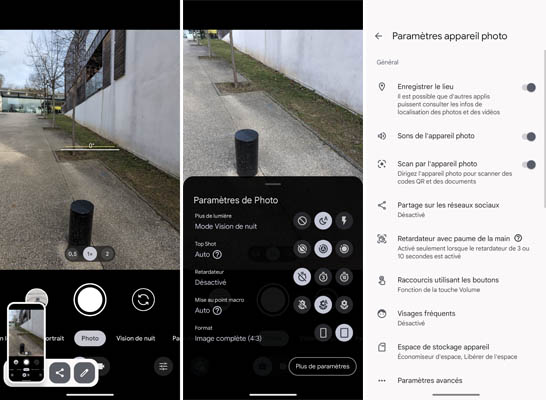 Par rapport à Android 13, l’interface de l’application appareil photo a subi une refonte graphique. La zone de cadrage domine l’affichage. À sa base, il y a 4 niveaux de zoom 0,5x, 1x et 2x disponibles juste au-dessus du bouton de déclenchement de l’image. Celui-ci est encadré entre l’aperçu de la dernière photo et le bouton pour passer en mode selfie. Dessous, plusieurs modes de prise de vue sont prévus, de gauche à droite, Panoramique avec mouvement, Exposition longue, Portrait, Photo, Vision de nuit et Panorama. Il n’y a pas d’autres modes réunis dans un menu. Les options sont disponibles tout en bas, en deux menus. Celui de gauche permet d’afficher certains paramètres tandis que celui de droite donne accès aux options de personnalisation de la prise de vue, comme un mode Pro avec la possibilité d’activer le mode Nuit, de gérer la luminosité, l’ombre, la balance des blancs, la mise au point, la vitesse d’obturation ainsi que l’ISO. Pour passer du mode Photo au mode Vidéo, il suffit de faire glisser le curseur situé au centre, tout en bas. Avec cette organisation, c’est beaucoup plus facile d’utiliser les différentes options mises à disposition.