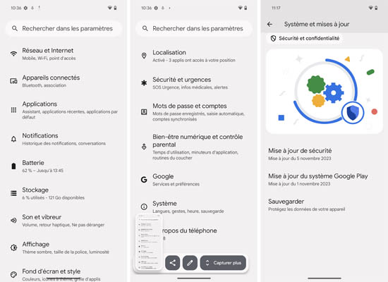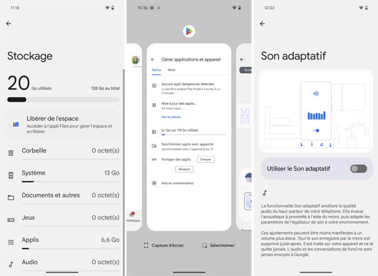 L’interface est toujours aussi épurée, uniquement avec les fonctions et les applications prévues par le géant américain. La mise à jour du système Google Play datait du 1 novembre 2022 et la mise à jour de sécurité du 5 novembre 2022, ce qui ne peut pas être plus récent. En termes de suivi dans le temps, Google a annoncé que l’appareil pourrait profiter de 7 ans de mises à jour du système et de sécurité, bien plus que tous les autres fabricants. Avec un Pixel, on est donc certain de pouvoir continuer à profiter des dernières nouveautés pendant un temps durable. Comptez sur 20 Go d’espace occupé par le système et les applications préinstallées, ce qui est tout à fait raisonnable et bien moins que sur les mobiles Samsung, par exemple.