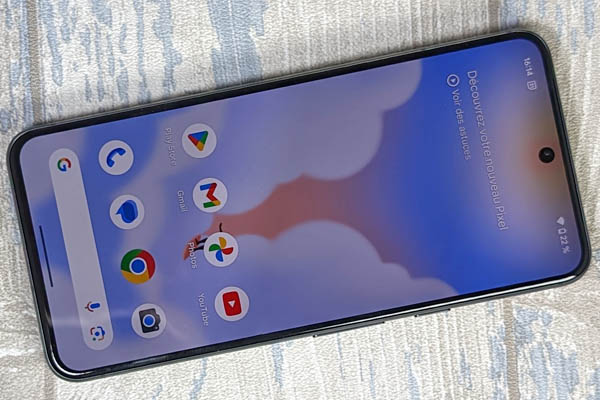 Le smartphone Google Pixel 8 est équipé d’un écran AMOLED de 6,2 pouces en diagonale, contre 6,3 pouces pour son prédécesseur. Les quatre coins sont plus arrondis que sur le précédent modèle. En outre, l’écran est plat comme sur le Pixel 8 Pro. Les bords noirs sur les parties latérales sont particulièrement fins, ainsi que sur les bords supérieurs et inférieurs. L’écran a un poinçon, tout en haut qui est cerclé d’une bordure noire. Il abrite le capteur photo frontal de l’appareil. On profite d’une définition maximale de 1080x2400 pixels que l’on ne peut pas changer.