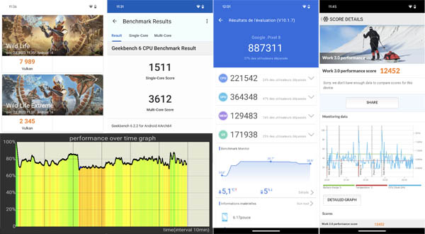 À l’usage, le smartphone s’est révélé extrêmement fluide. Nous n’avons constaté aucun ralentissement ni aucune saccade lors de parcours dans les différents menus et dans la navigation en général. Les applications sont lancées avec une parfaite vélocité et on peut passer de l’une à l’autre en moins de temps qu’il ne faut pour le dire. Comme pour les autres smartphones, nous avons soumis le Google Pixel 8 à quelques outils de mesure de performances brutes afin de le comparer aux autres téléphones du marché. On note une augmentation significative des performances par rapport au précédent chipset de Google.